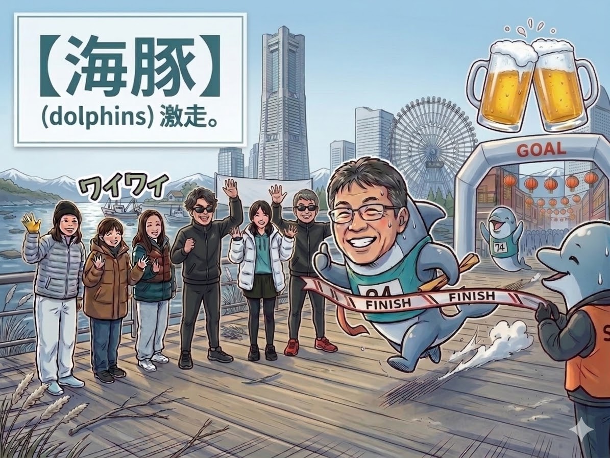 海辺の強い寒風の中スイスイ快走とはいかず、苦悶の表情で激走する海豚たち。
